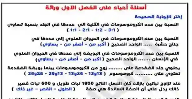 أسئلة للتدريب على مادة الأحياء للصف الأول الثانوي الفصل الأول وراثة
